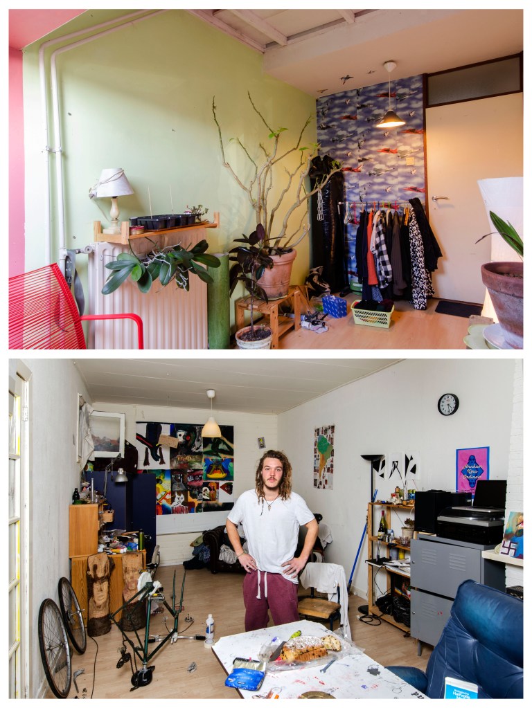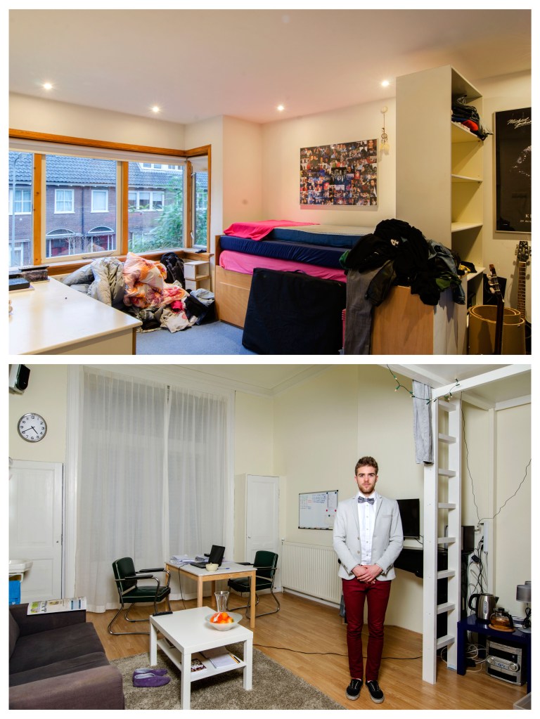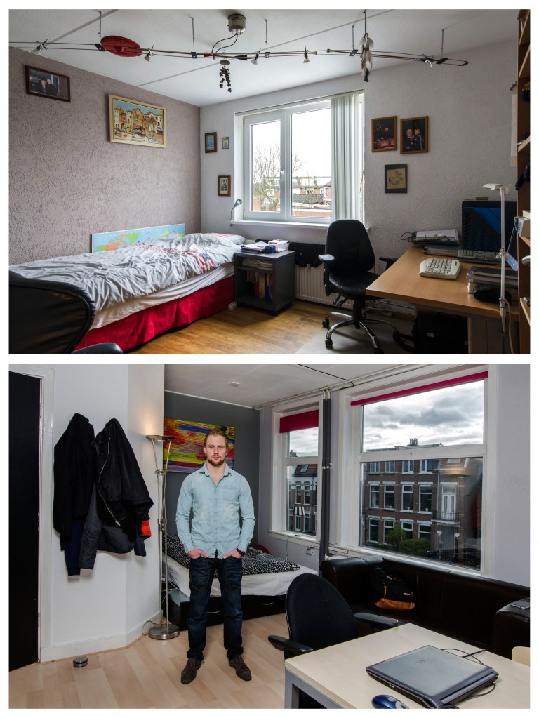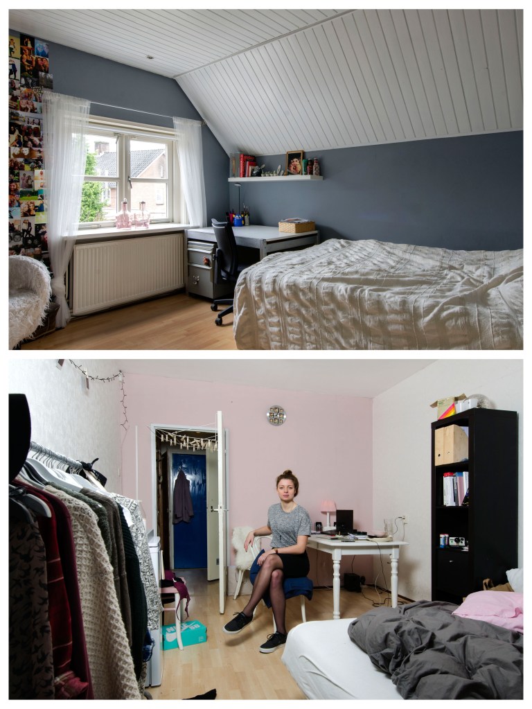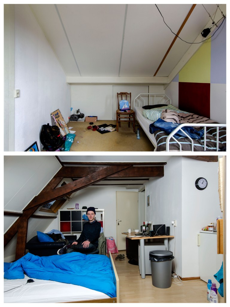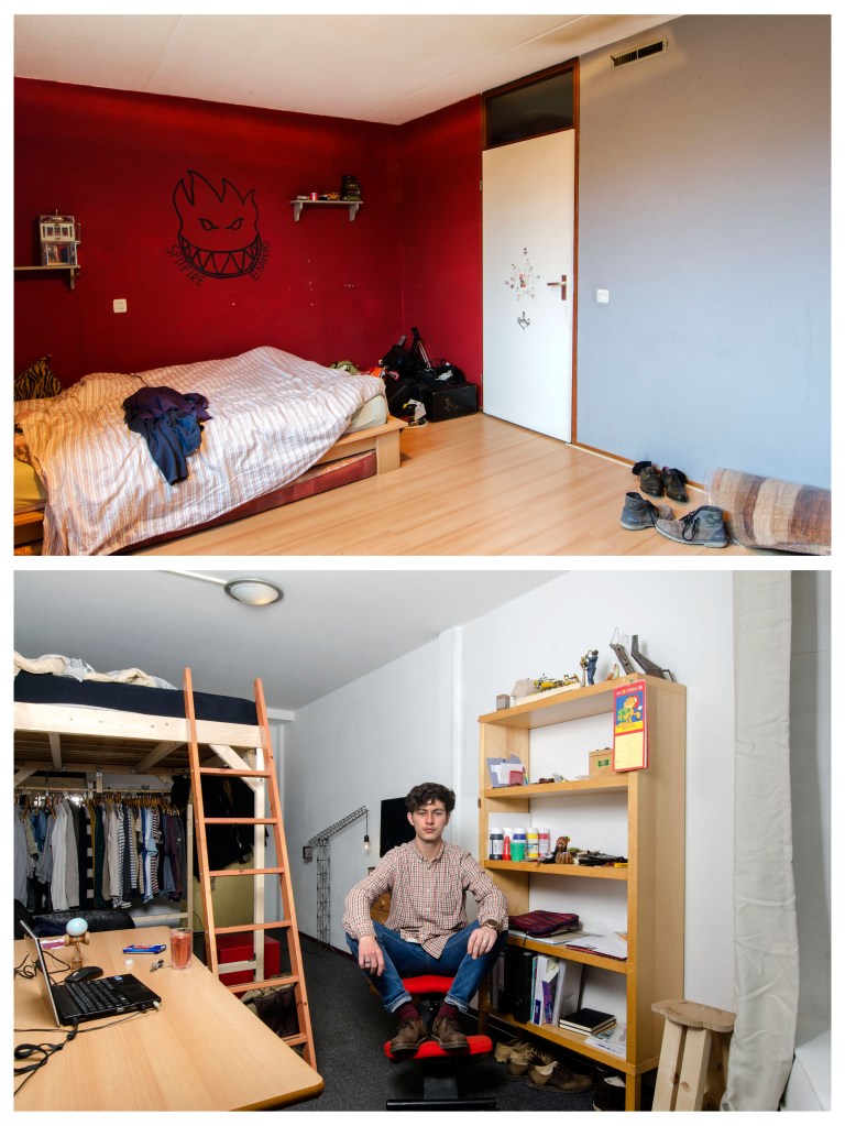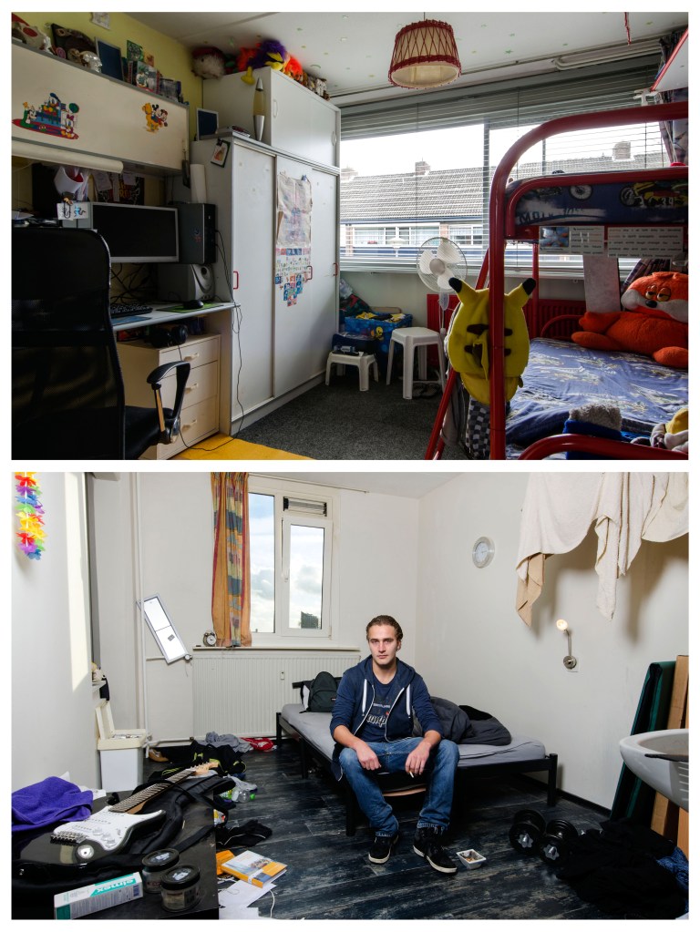 Elke student behoud over het algemeen in het ouderlijk huis zijn of haar kinderkamer. Vaak wordt hier alleen nog in het weekend en tijdens tentamenweken geslapen, gestudeerd en geleefd. In de nieuwe studentenkamer slaapt, eet, studeert, feest, rookt, vrijt, en leeft de student van maandagochtend tot vrijdagmiddag. Zo leeft de student min of meer in twee werelden. Ik vind het fascinerend dat de kinderkamer vaak leeg en karig wordt achter gelaten. Meubels, kleding en andere dingen, spullen die de kamer karakter geven gaan mee naar de nieuwe studentenkamer. De kinderkamer wordt gestript en op den duur wordt er veelal een hobby- of strijkkamer van gemaakt, voorzien van een logeerbed. De nieuwe studentenkamer is kwiek ingericht, het karakter van de bewoner is daar te zien, ruiken en voelen. Het contrast van deze twee werelden, het verschil tussen de leegte en de leefbaarheid beoogde ik vast te leggen in deze fotoserie waarmee ik afstudeerde aan de fotovakschool in 2015.